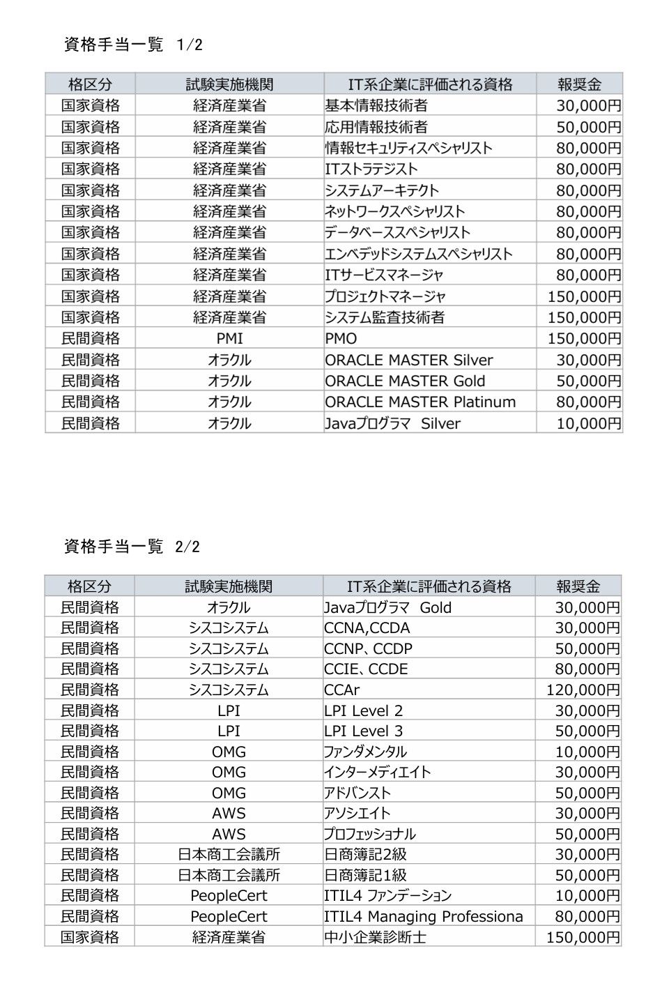 下記に添付する資格を取得した場合に取得報奨金を支払いますので、
